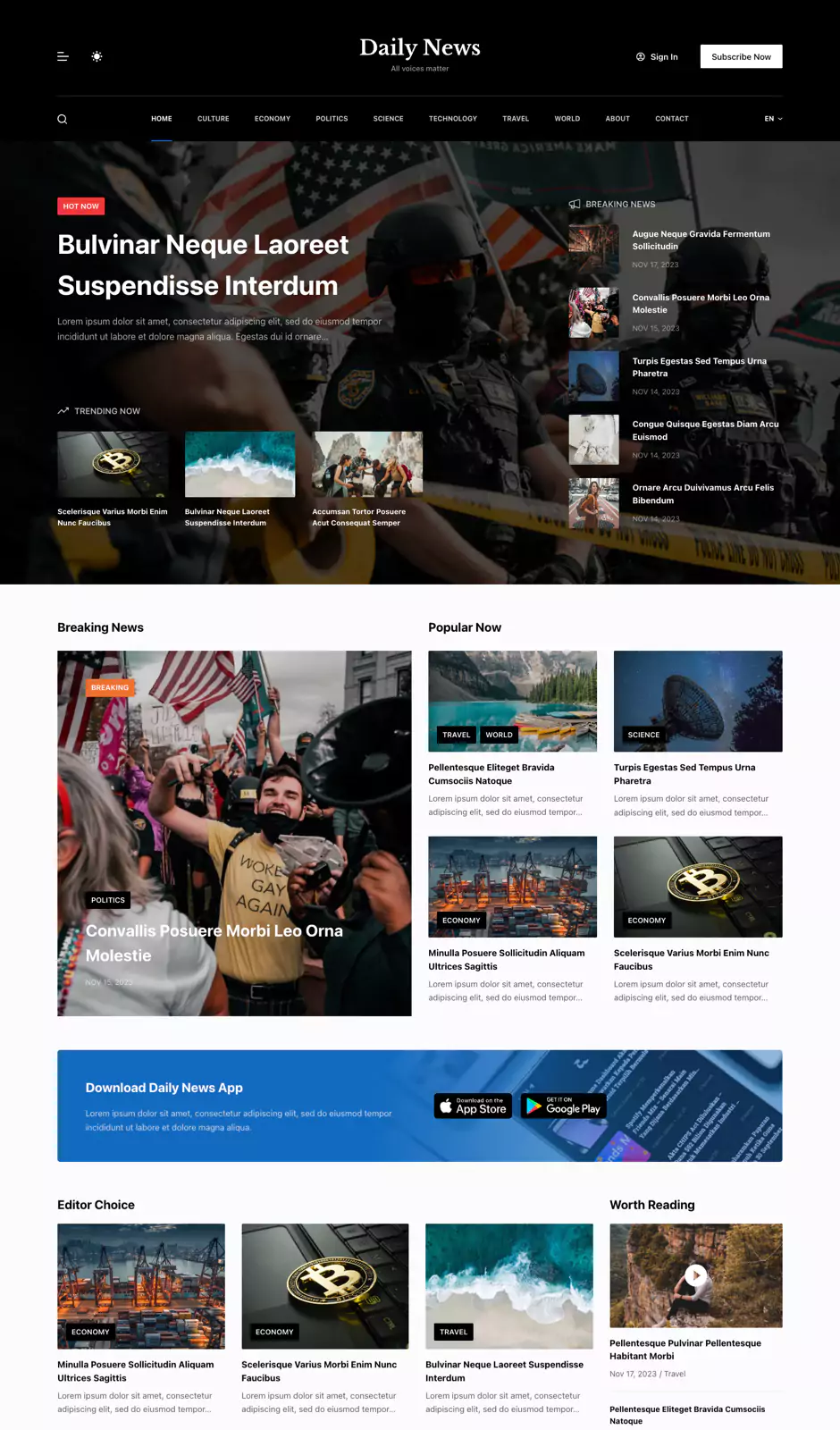 Daily News provides a magazine-style layout with dark mode, multi-language support, and eye-catching visuals to effectively engage readers and present content.